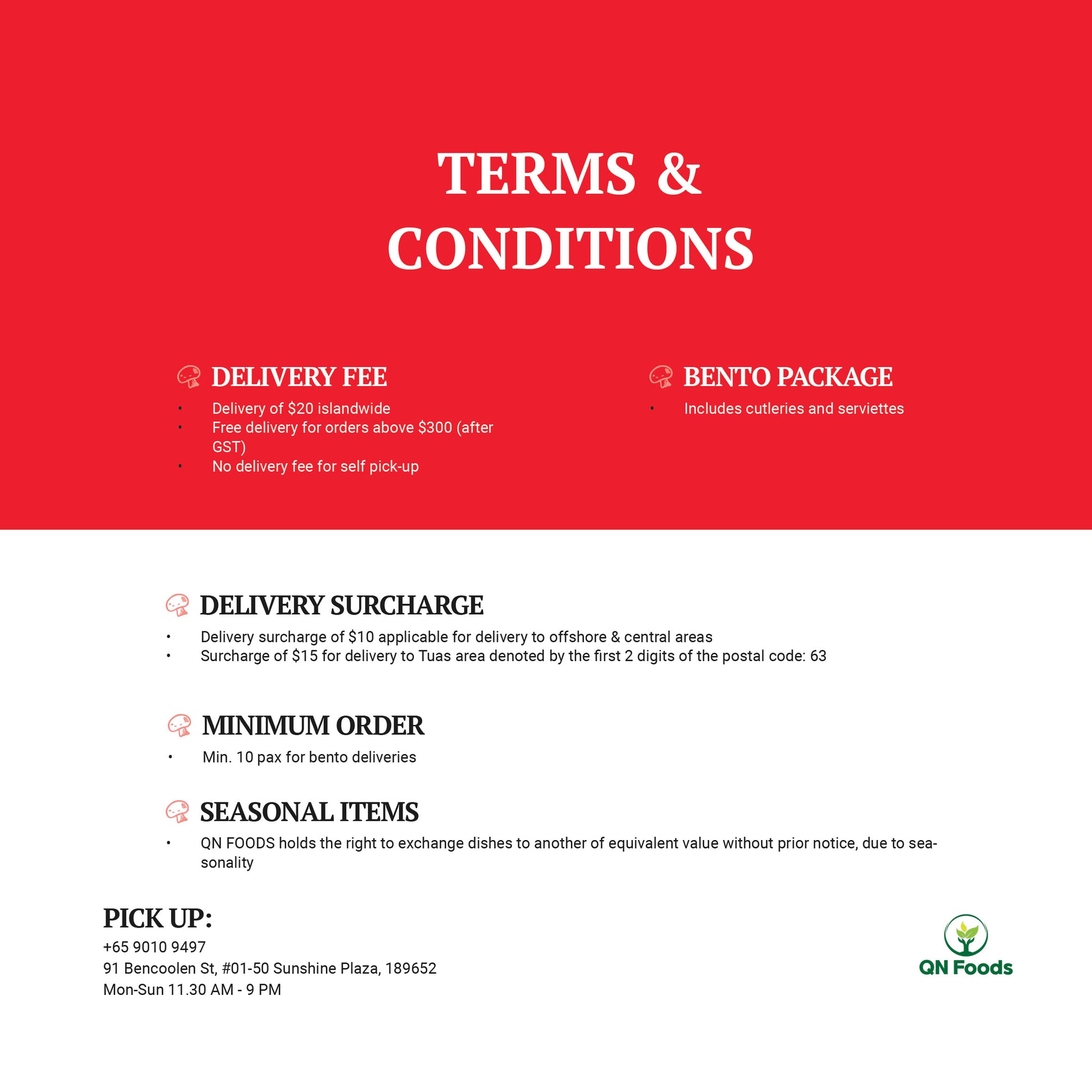 - For bulk orders of 100 bentos or more, contact us at 9010 9497 or hello@qn-global.com for a quote.